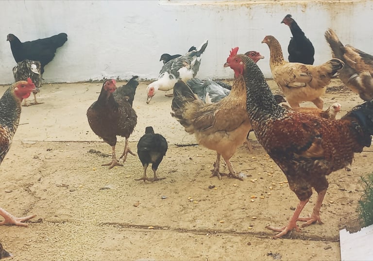 Chickens roaming freely on open pasture.